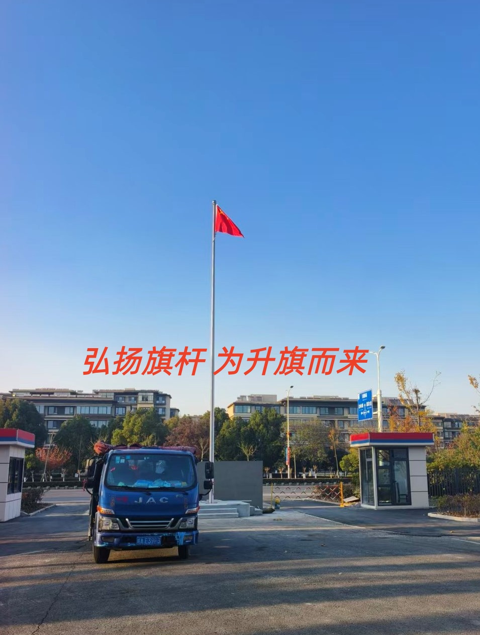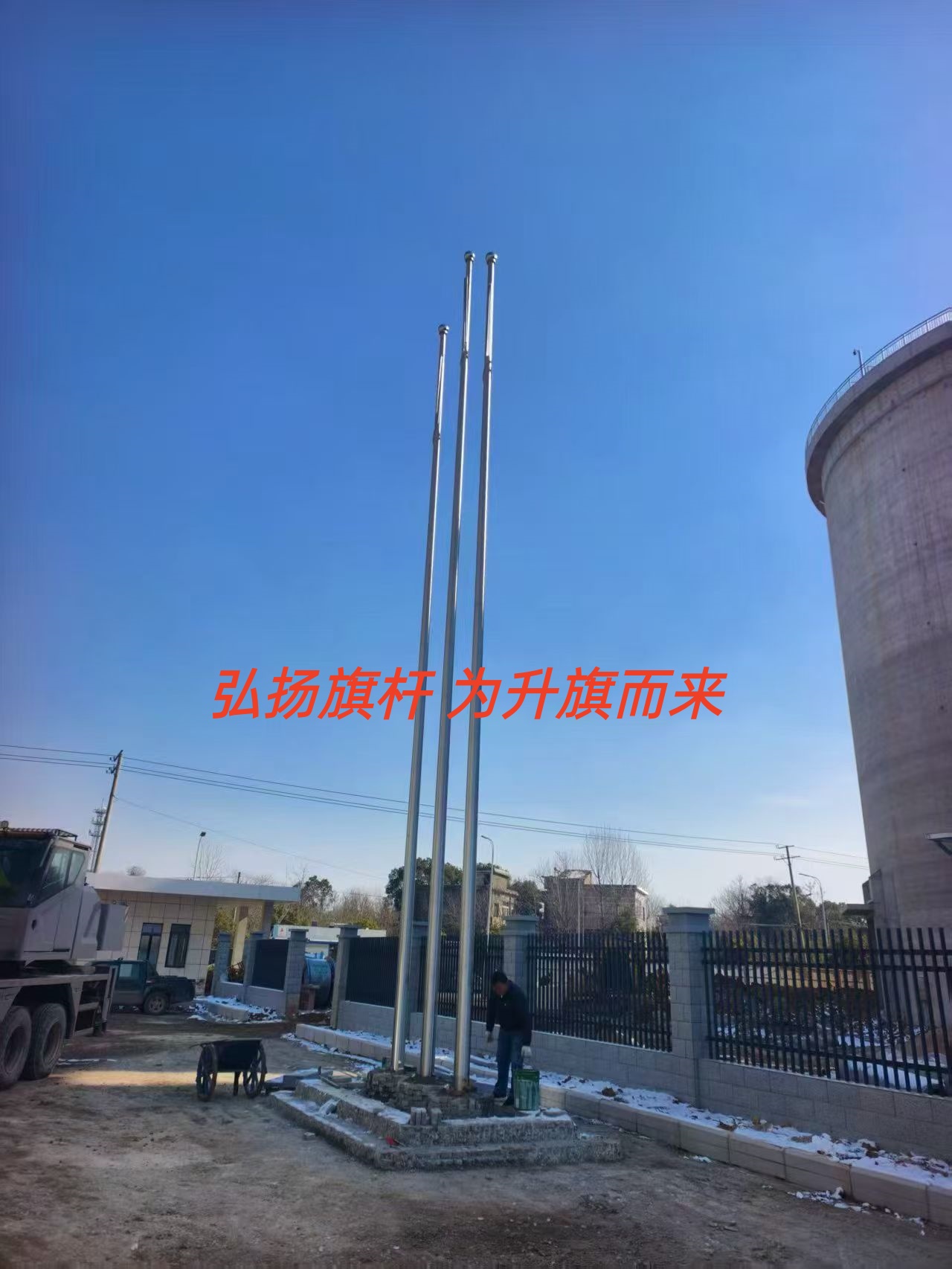 江苏润华和泰科技股份有限公司三支锥形旗杆安装完工 江苏旗杆岗亭道闸定制厂家